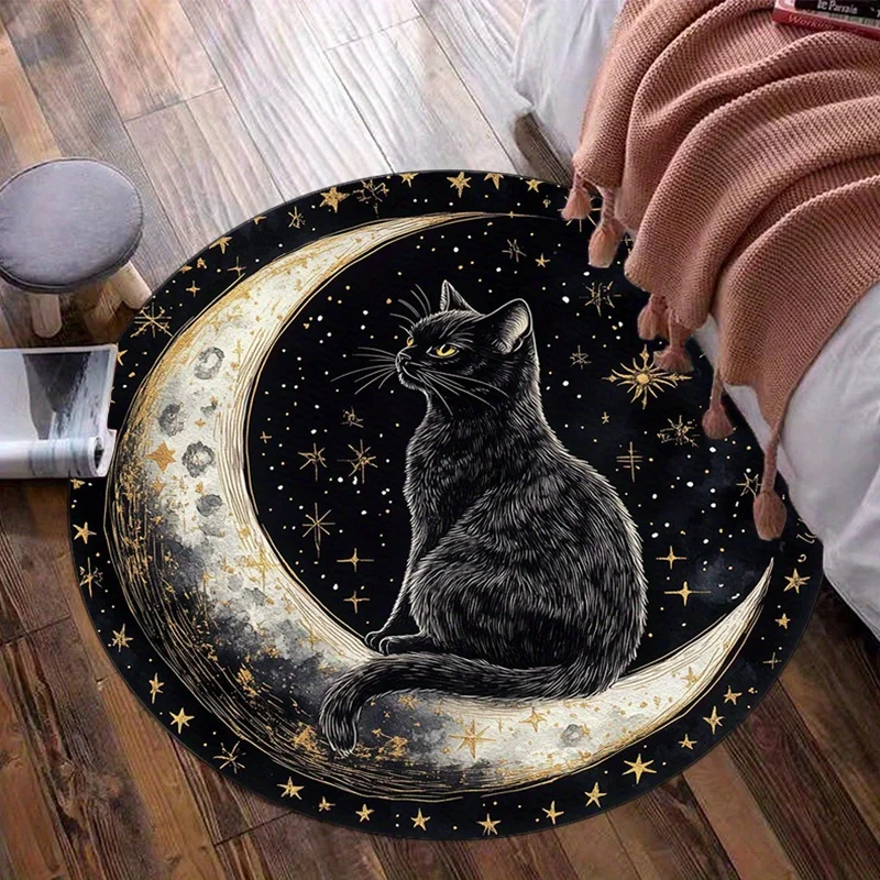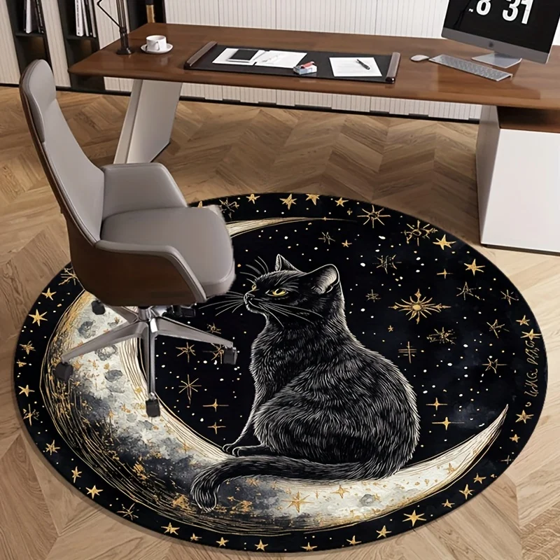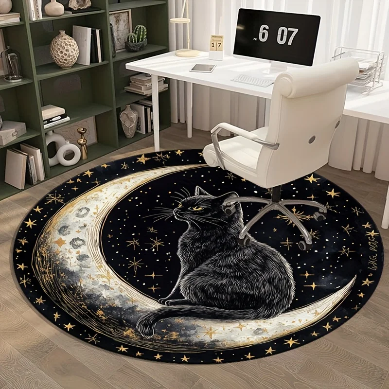This round rug features a striking black cat sitting on a glowing moon set against a starry night sky. Its mystical fantasy design adds depth and personality to any room. The soft, plush surface creates a cozy and comfortable feel under your feet. Perfect for bedrooms, reading nooks, or living room corners, it enhances any space with magical charm. The vibrant celestial artwork makes it an eye-catching centerpiece. It includes a non-slip backing to help keep the rug securely in place. Durable materials ensure the design remains bright and the rug maintains its shape with everyday use. Its round shape adds balance and softness to modern or whimsical décor themes. Lightweight and easy to clean, it’s ideal for both decorative and practical use. This rug brings a dreamy, artistic touch to your home while creating a warm and inviting atmosphere.