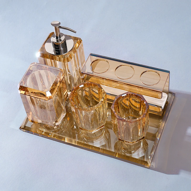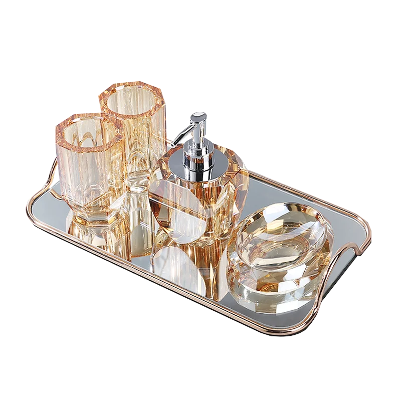 This crystal bathroom amenity set adds a touch of luxury and elegance to any bathroom space. Each piece features a sparkling crystal design that enhances the look of your vanity or countertop. The set includes a soap dish, sanitizer or lotion bottle, mouthwash cup, and matching storage tray. Its sturdy, high-quality construction ensures long-lasting durability and daily practicality. The coordinated pieces help keep your bathroom organized and clutter-free. Perfect for both modern and classic bathroom décor styles, it elevates the overall aesthetic instantly. The smooth surfaces are easy to clean and maintain, offering effortless hygiene. Ideal for homes, hotels, guest bathrooms, or as a stylish gift for any occasion.