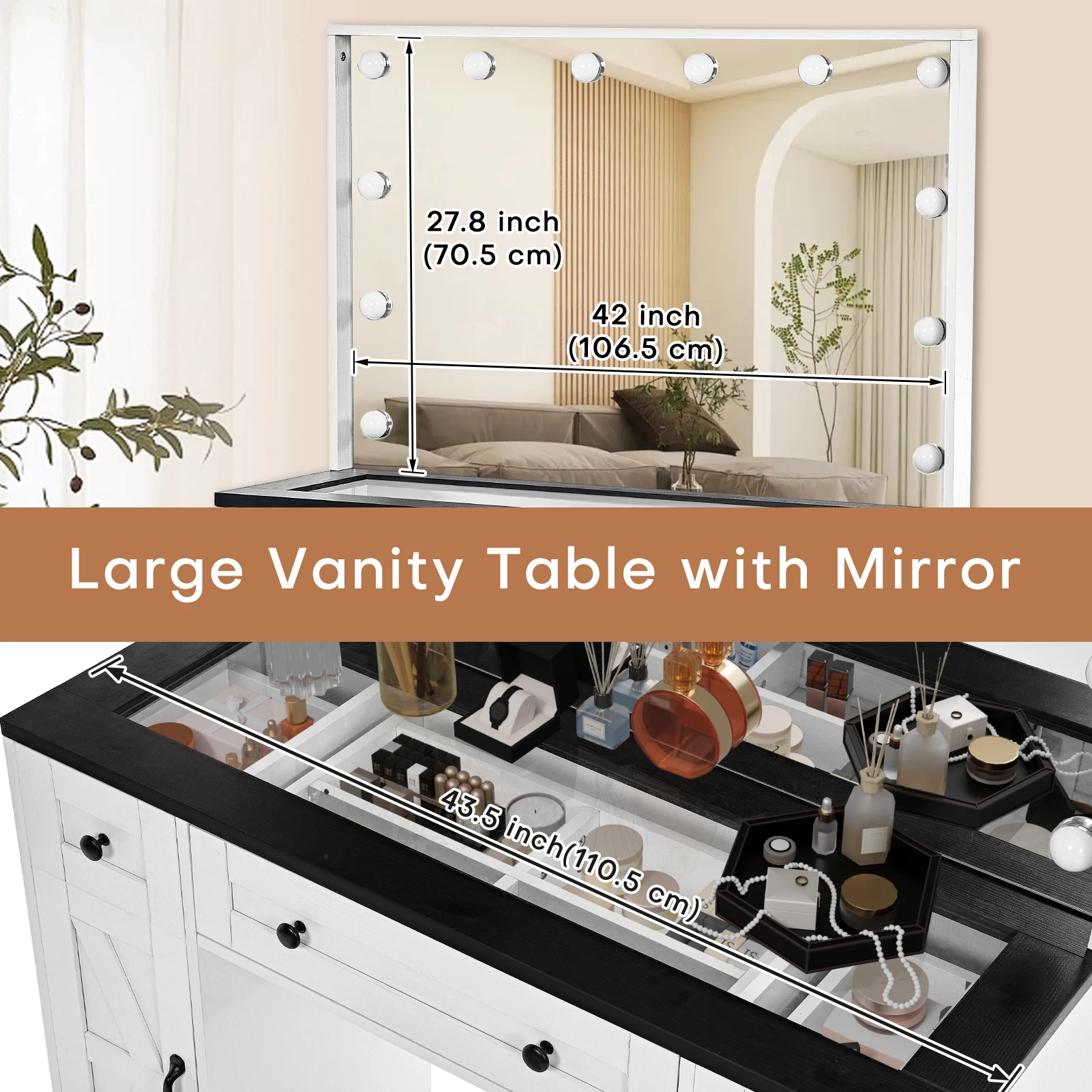 Elevate your beauty routine with this charming Farmhouse Vanity Desk featuring a Hollywood-style lighted mirror. Designed with rustic appeal and modern function, it includes 3 smooth-glide drawers and 2 spacious cabinets for effortless organization. The bright, even LED lighting provides flawless visibility for makeup, skincare, and hairstyling. A wide tabletop offers plenty of room for daily essentials, accessories, and decorative touches. Crafted with durability in mind, it brings a warm, stylish presence to any bedroom or dressing space. This vanity desk is the perfect blend of storage, elegance, and practicality for both teens and adults.