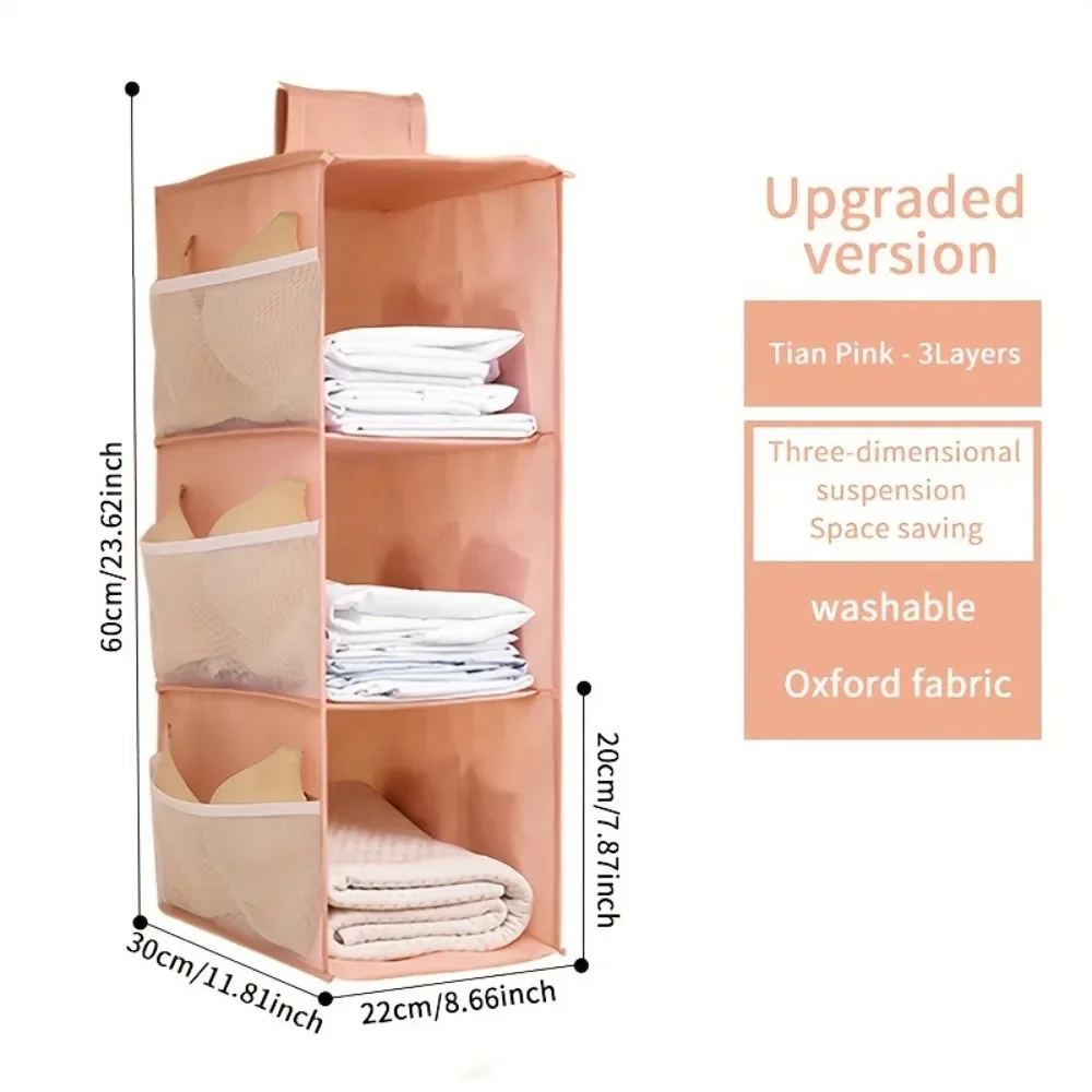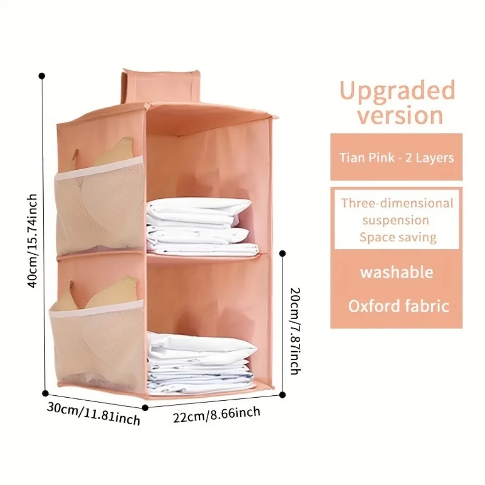 This multi-layer hanging wardrobe organizer is designed to keep your bras, underwear, socks, and small clothing items neatly sorted. Made from high-quality non-woven fabric, it is lightweight, breathable, and washable for long-lasting use. The folding design makes it easy to store or move when not in use. Multiple compartments allow you to separate different items for quick and easy access. It hangs conveniently in any closet or wardrobe, maximizing vertical space. The reinforced stitching ensures durability even when fully loaded. Its transparent pocket design lets you see everything at a glance. The organizer protects delicate garments from dust and damage. Installation takes just seconds with the built-in hook system. It keeps your closet tidy and eliminates cluttered drawers. Perfect for small bedrooms, dorms, and apartments. A practical and stylish solution for maintaining organized daily essentials.