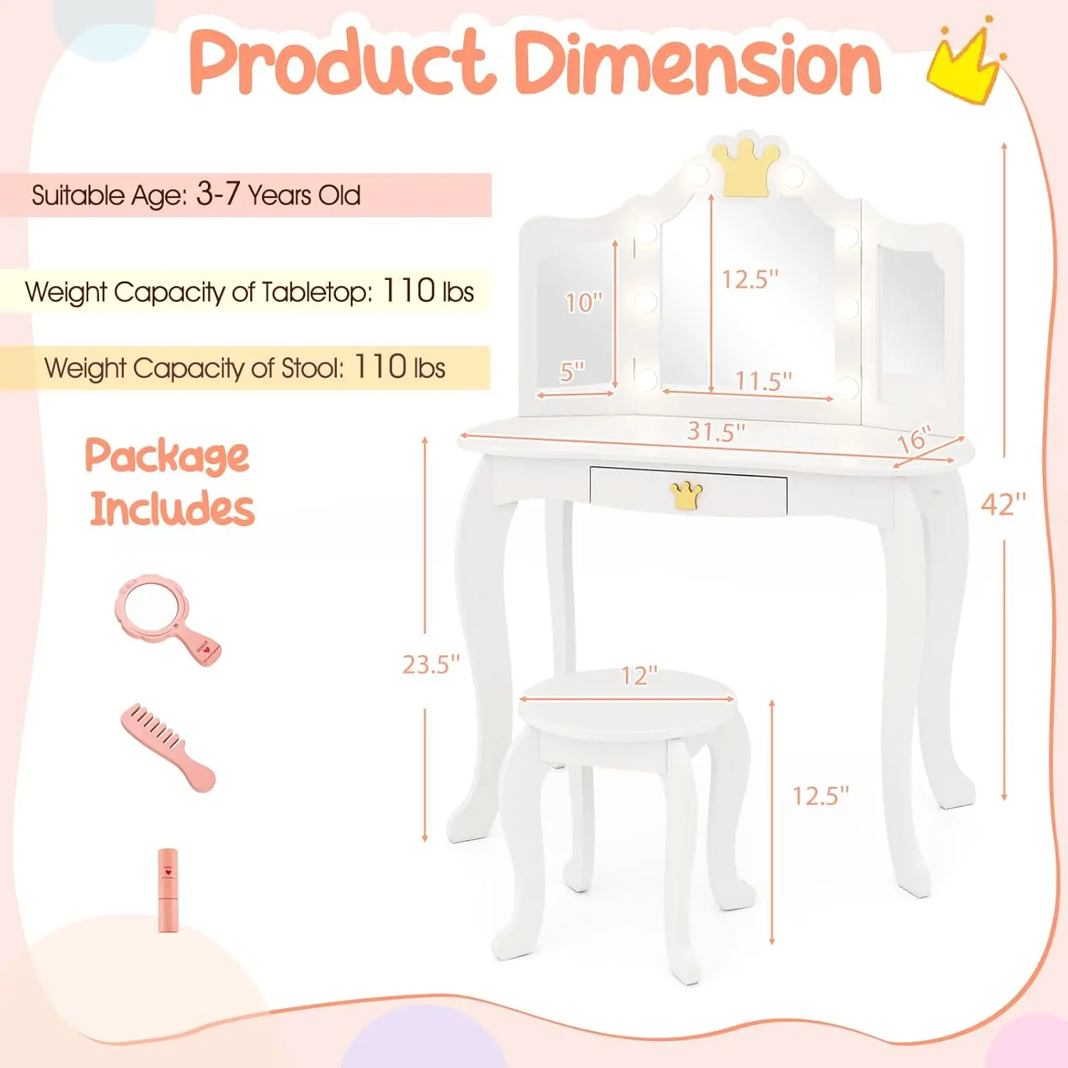 This kids vanity set features a bright LED lighted mirror that adds fun and functionality to your child’s daily routine. Designed in a modern white finish, it blends seamlessly into any bedroom or playroom décor. The set includes a comfortable stool and a spacious drawer to keep small accessories neatly organized. Its 2-in-1 design works both as a makeup desk and a writing or activity table. The mirror provides clear visibility, helping kids practice grooming and imaginative play safely. Built with sturdy materials, this vanity offers long-lasting durability for everyday use.