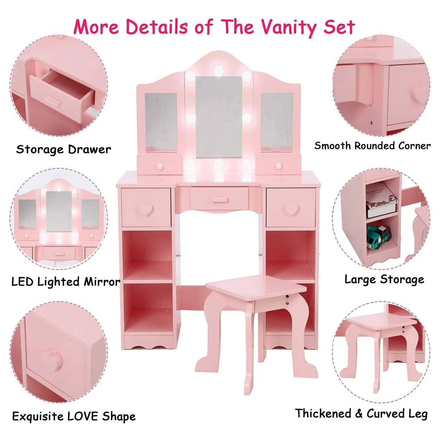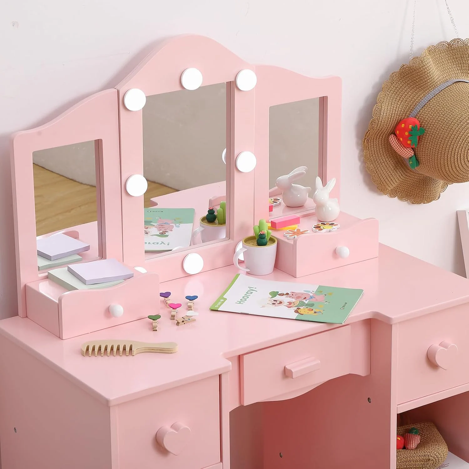 This children’s dressing table features a charming tri-fold mirror that lets kids see from every angle during pretend play. Built with open storage shelves, it keeps brushes, accessories, and toys neatly organized and within easy reach. The included chair is perfectly sized for toddlers and young children, offering safe and comfortable seating. Its sturdy construction and anti-tip design ensure durability and stability for everyday use. The playful, princess-inspired style makes it a delightful addition to any child’s bedroom or playroom. Spark imagination and confidence with this adorable vanity set designed for endless creative fun.