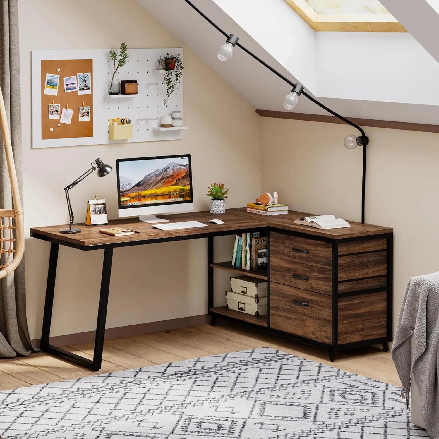 This 53-inch L-shaped computer desk offers a space-saving design perfect for home offices, apartments, or small rooms. Crafted with a rustic brown finish and industrial metal frame, it brings both style and durability to your workspace. The desk includes three fabric drawers that provide convenient storage for documents, stationery, and personal items. Built-in open shelves offer additional room for books, accessories, and office essentials. Its L-shaped design maximizes corner spaces and provides ample room for both computer tasks and writing. Adjustable feet