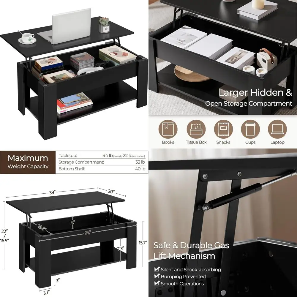 This lift-top wooden coffee table offers both style and smart functionality for any living room or dining area. The lift-top design provides an elevated surface perfect for working, eating, or reading. Beneath the top is a spacious hidden storage compartment ideal for keeping remotes, magazines, and daily essentials out of sight. A lower open shelf adds additional storage for baskets, décor, or books. The wooden finish brings a warm, modern charm to any home décor style. Its sturdy construction ensures stability and long-lasting durability. The smooth lifting mechanism operates quietly and effortlessly. This table is perfect for small spaces needing multifunctional furniture. Designed for convenience, it keeps your living area neat and organized. With its practical features and stylish design, this coffee table becomes a centerpiece in any room.