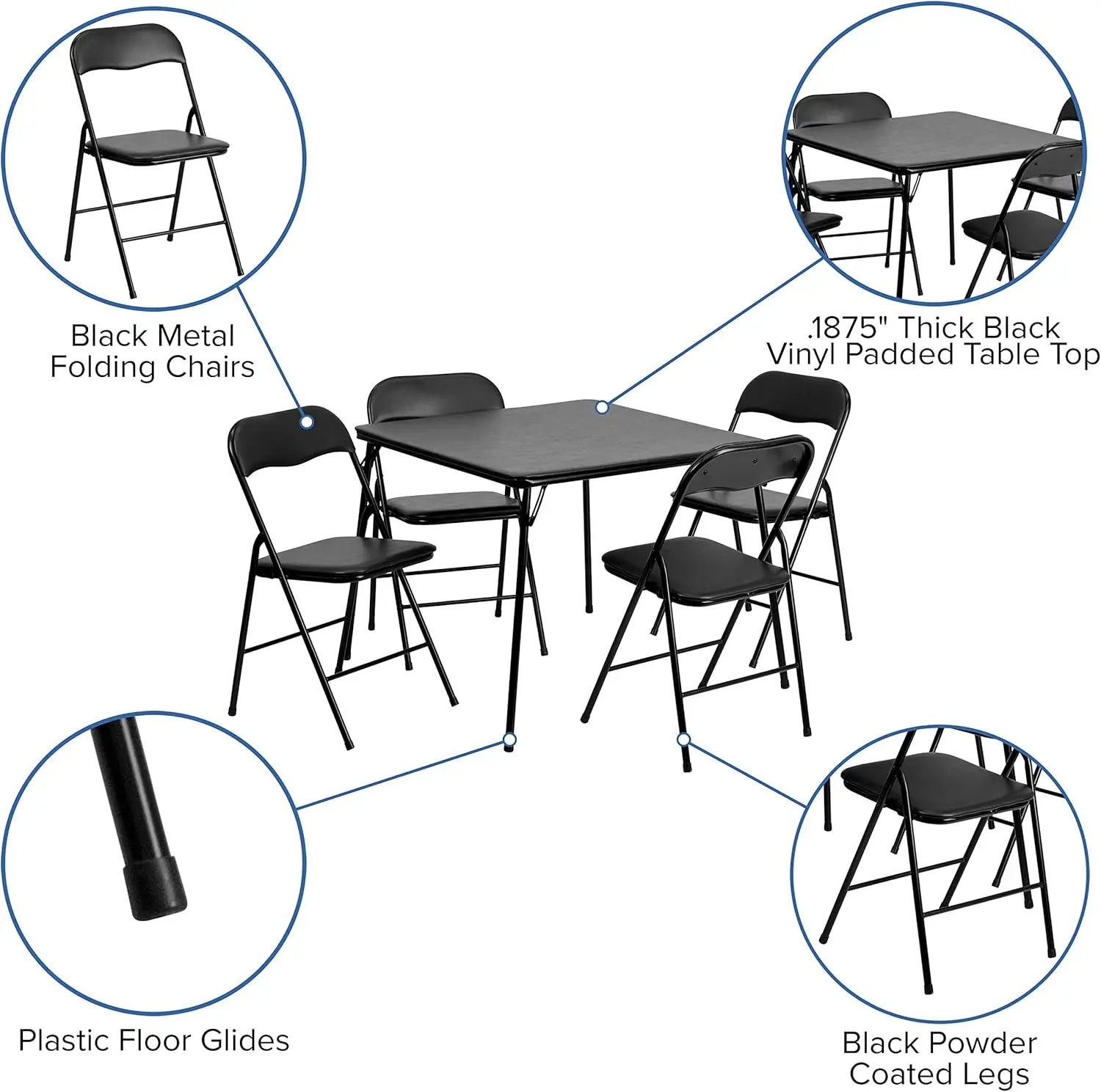 The Madison 5-Piece Folding Card Table and Chairs Set provides a convenient, portable seating solution for events, parties, and everyday use. The sturdy folding table offers a spacious surface ideal for card games, puzzles, crafts, dining, and more. Four matching folding chairs feature comfortable padding and durable construction for long-lasting support. The entire set folds flat, making storage and transport quick and hassle-free. Its sleek black finish blends easily with any décor, from casual gatherings to professional events. Perfect for homes, community centers, and offices, this versatile set delivers practical function wherever extra seating is needed.