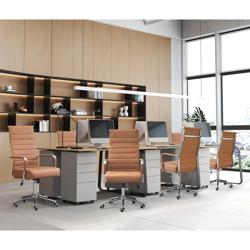 This modern PU leather office chair combines executive style with ergonomic comfort, making it perfect for conference rooms, home offices, and professional workspaces. The high-back ribbed design offers excellent lumbar support, helping reduce fatigue during long hours of sitting. Smooth-rolling wheels and a 360° swivel base allow effortless movement across your workspace. The padded armrests provide added comfort while maintaining a sleek, contemporary appearance. Made with durable PU leather, the chair is easy to clean and built to last. Its height-adjustable mechanism ensures the perfect seating position for productivity. The sturdy metal frame enhances stability and long-term reliability. With its stylish design and ergonomic features, this chair elevates both comfort and office décor.