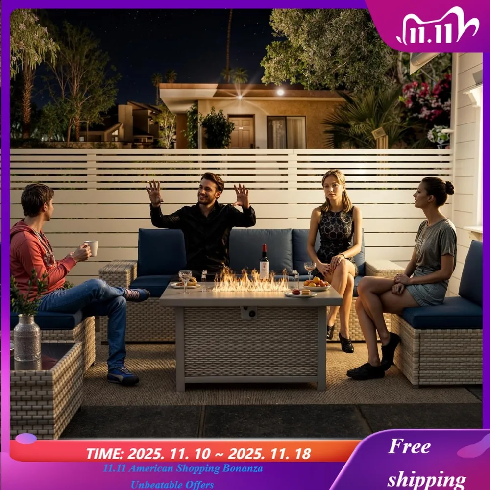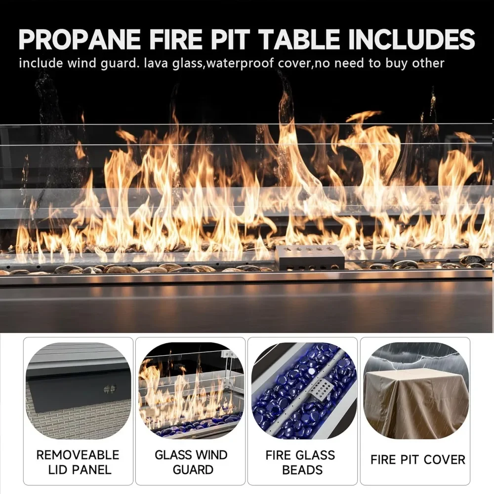 This 40.5-inch rectangular fire pit table brings powerful warmth and modern style to any outdoor setting. With a 60,000 BTU output, it delivers strong, consistent heat for cool evenings. The auto-ignition system provides quick, effortless startup every time. A glass wind guard surrounds the burner, keeping the flame steady in breezy conditions. Its sleek grey finish complements a wide range of patio furniture. The spacious tabletop offers convenient room for drinks and snacks. Designed to house a 20 lb propane tank internally, it keeps your setup neat and clutter-free. Durable materials ensure long-lasting outdoor performance. The clean-burning propane system produces warmth without smoke or ash. This fire pit is perfect for outdoor gatherings, family nights, and relaxing on the patio. It adds both comfort and visual appeal to your outdoor space. Enjoy a stylish, functional centerpiece that enhances every outdoor moment.