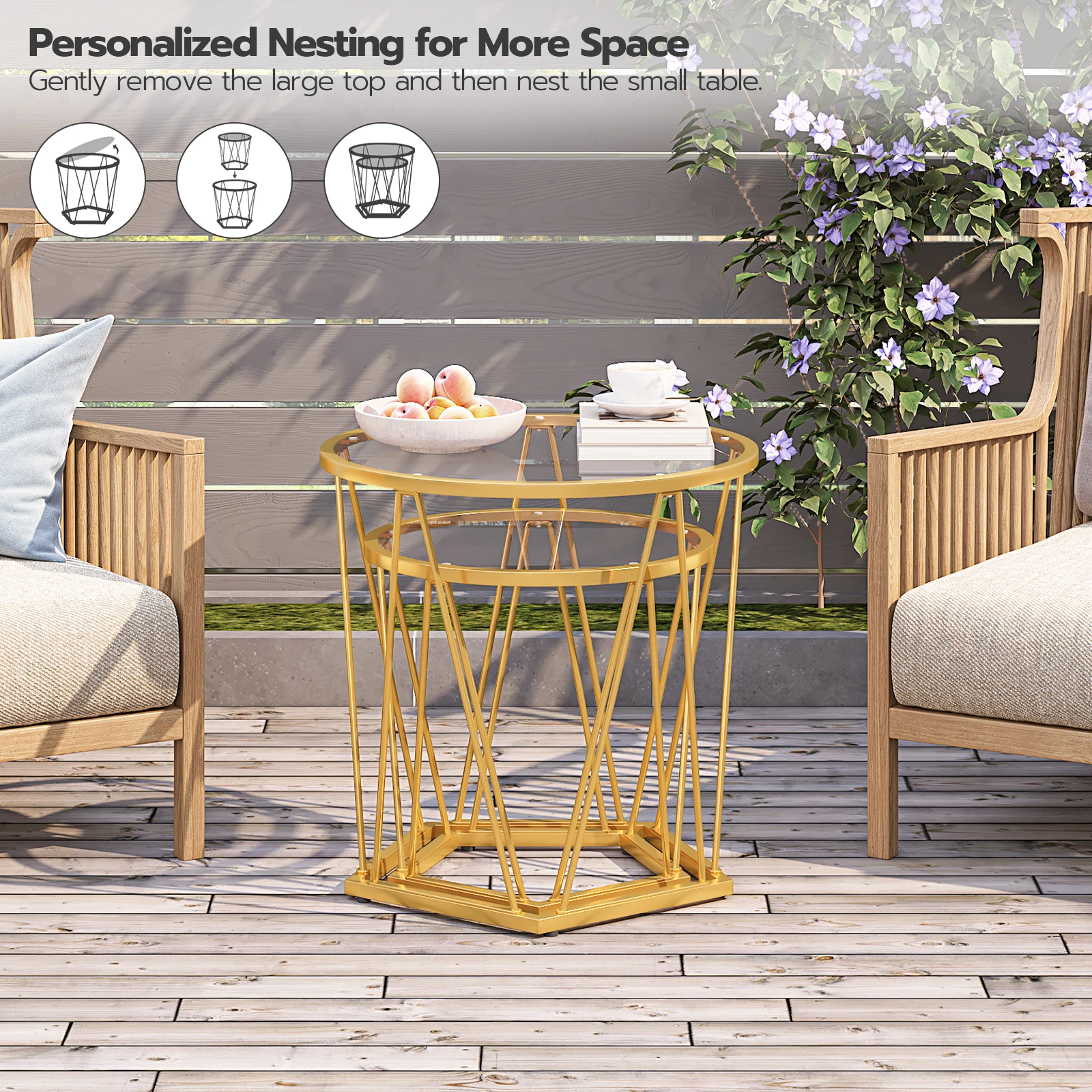 This HOOBRO coffee table set of 2 brings a touch of elegance and modern style to any space. Each table features a round glass top that adds sophistication while making your room feel open and bright. The gold metal frame provides a chic, contemporary look that complements a variety of décor styles. These tables can be used together as a stylish coffee table arrangement or separately as end tables. Their compact size makes them perfect for living rooms, bedrooms, or balconies. The sturdy metal construction ensures durability and long-lasting use. The smooth glass surface is easy to clean and ideal for displaying décor, drinks, or magazines. Lightweight and easy to move, you can rearrange them to suit your needs anytime. The nesting design helps save space while offering functional flexibility. This elegant table set enhances your home with beauty, practicality, and modern charm.