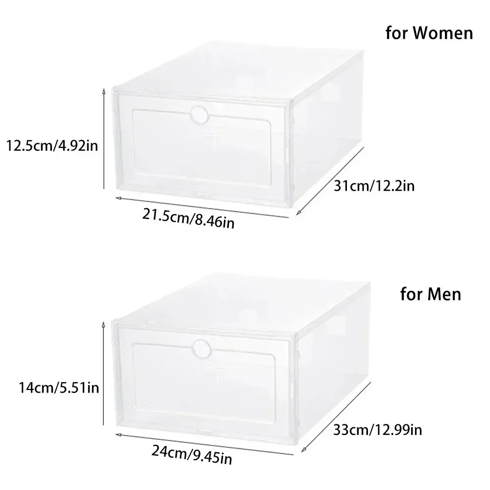 This set of 6 transparent shoe boxes provides a clean and organized way to store your footwear. Each box is made from durable plastic that protects shoes from dust, moisture, and everyday wear. The clear design allows you to easily see what’s inside without opening the lid. These boxes are fully stackable, helping you maximize floor and shelf space in closets or entryways. Ventilation holes promote airflow and help keep your shoes fresh. The secure front-opening door makes it convenient to access your shoes even when stacked. They are perfect for sneakers, heels, flats, and everyday shoes. The sturdy frame keeps its shape, ensuring long-lasting use. Designed to fit most standard shoe sizes, they offer versatile storage for men, women, and kids. Their modern minimalist look blends well with any home decor style. Assembly is quick and easy, requiring no tools. With these stackable shoe cases, organizing your footwear collection becomes effortless and stylish.