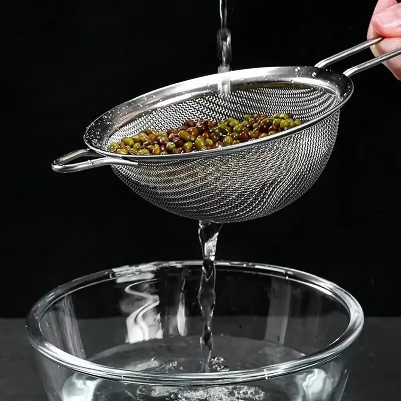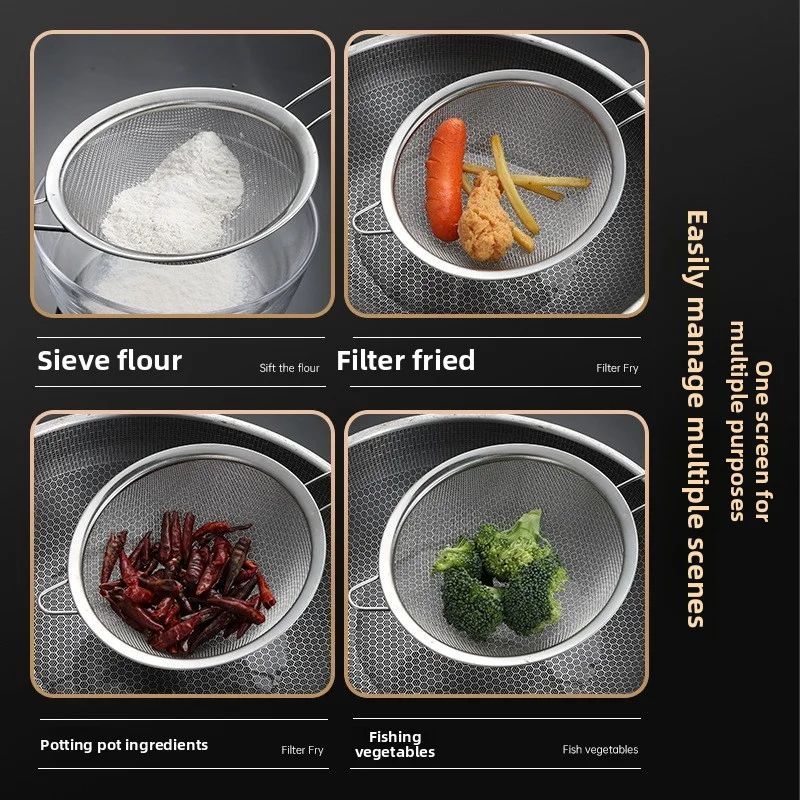 This stainless steel sieve combines a fine mesh filter with a slotted spoon for versatile kitchen use. Ideal for sifting flour, straining liquids, or draining oil, it simplifies many cooking and baking tasks. The durable stainless steel construction ensures long-lasting performance and resistance to rust. Its ergonomic handle provides a comfortable grip for easy and precise handling. Perfect for both professional chefs and home cooks, it enhances efficiency in the kitchen. Lightweight, easy to clean, and highly practical, this tool is a must-have for every cooking and baking setup.