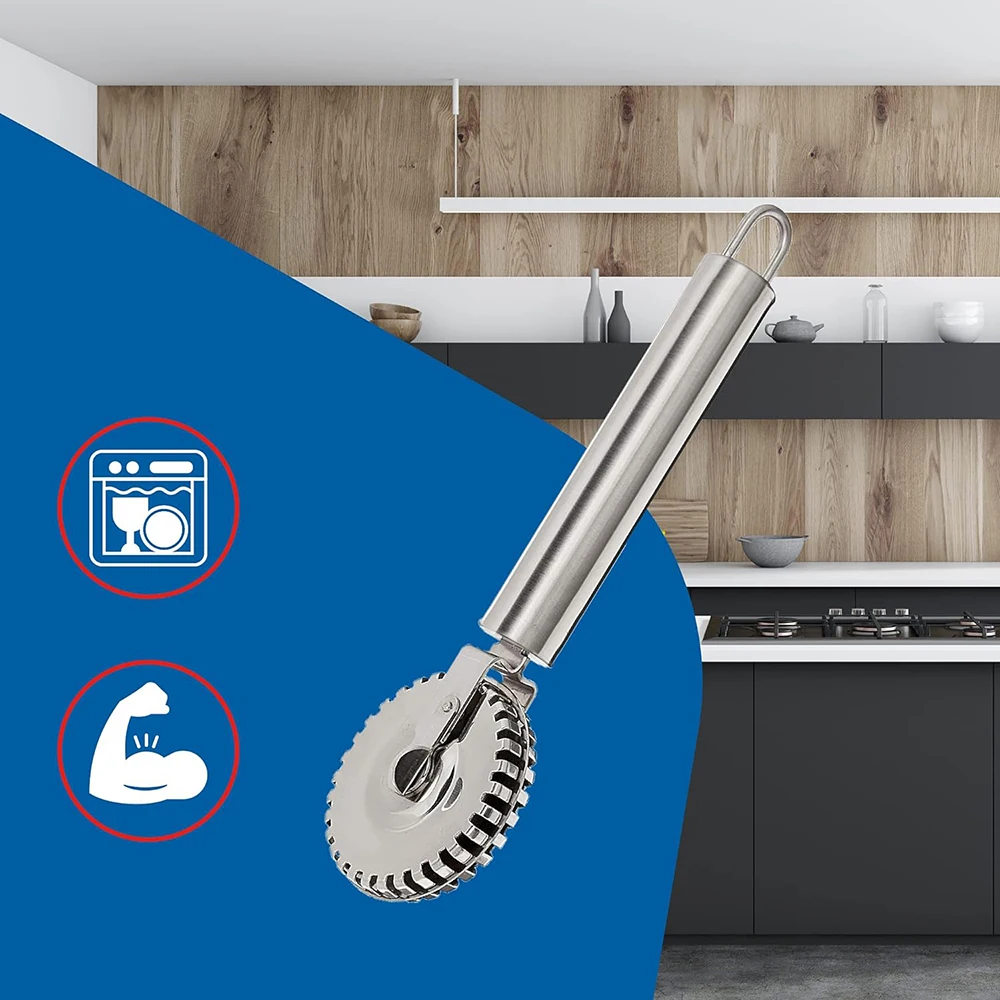 This stainless steel ravioli cutter wheel is perfect for cutting, sealing, and crimping fresh pasta and pastry dough. Its sharp, durable wheel ensures clean, precise cuts every time, making pasta preparation easier and more professional. The ergonomic handle provides a comfortable grip for smooth and controlled rolling. Ideal for homemade ravioli, dumplings, pies, and other pastries, it adds both convenience and efficiency to your kitchen. Made from high-quality stainless steel, it is resistant to rust and easy to clean. A must-have tool for both amateur cooks and culinary enthusiasts, it helps create beautifully crafted pasta and pastries every time.