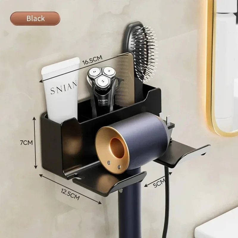 Keep your styling tools neatly organized with this wall-mounted hair dryer and straightener holder. Designed to hold most hair dryers, flat irons, curling wands, and accessories, it features a secure cradle and storage box to keep everything in one convenient place. The sturdy design ensures safe, heat-resistant storage, while the built-in shelf provides extra space for brushes, combs, or skincare products. Perfect for bathrooms with limited countertop space, this organizer helps reduce clutter and keeps your essentials within easy reach. A must-have upgrade for tidy, modern bathrooms.