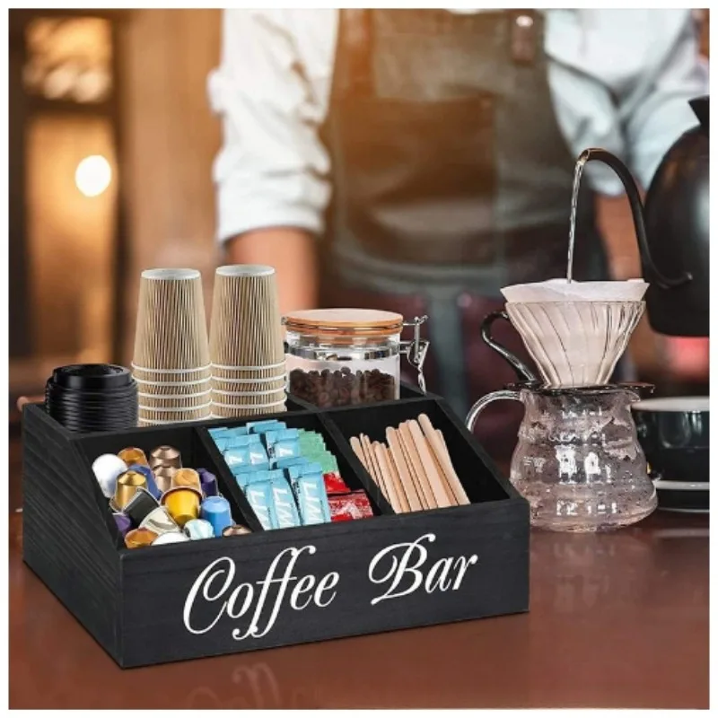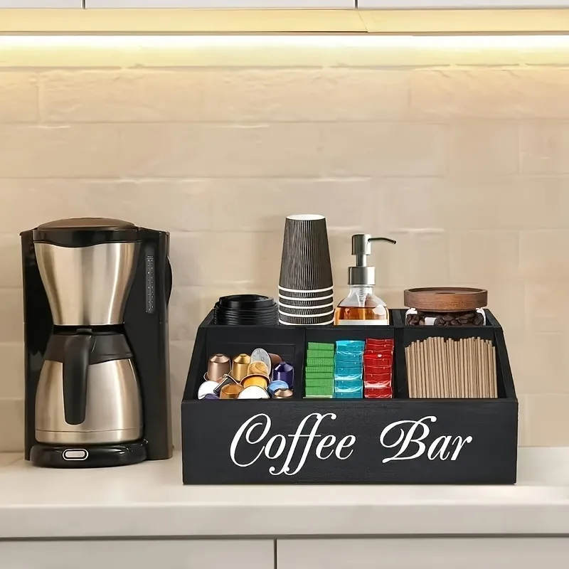 This Wooden Coffee Storage Box offers a stylish and practical way to organize your kitchen counter. Crafted from durable wood, it adds a warm, rustic touch to any coffee bar or kitchen space. The spacious interior provides room for coffee pods, tea bags, spices, sugars, and other essentials. Its multi-purpose design makes it ideal for both beverage stations and general countertop storage. The open-top layout ensures quick access to your everyday items. Smooth edges and a sturdy build ensure long-lasting use. Compact yet roomy, it fits easily on counters, shelves, or inside cabinets. The natural wood finish blends effortlessly with modern, farmhouse, or minimalist décor. Perfect for decluttering busy kitchen areas and keeping everything neatly in place. Lightweight construction allows for easy repositioning as your needs change. Great for organizing small jars, packets, and seasonings. This versatile storage box elevates both functionality and aesthetics in your coffee bar or kitchen.